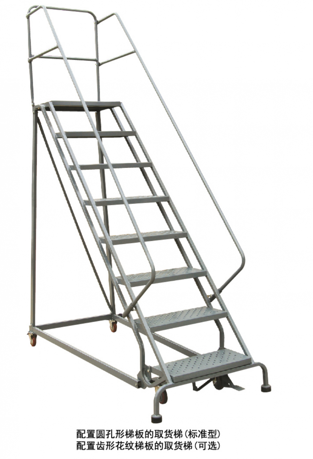 ● 配置踏板锁定机构,踩压底部踏板可自动固定梯子;踩压底部踏板下方的解除锁定压杆.便可轻松移动取货梯